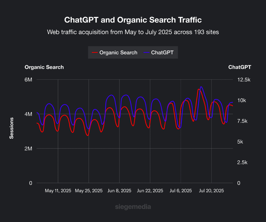 الجديد في 2025: البيانات الحديثة تؤكّد هذا. في حين أنّ ChatGPT traffic يتقلَّب ويُظهِر عدم استقرار، Google organic traffic يستمرُّ في النموّ المُطَّرد. الاستثمار في SEO أصبح أكثر أماناً من أيِّ وقتٍ مضى.
