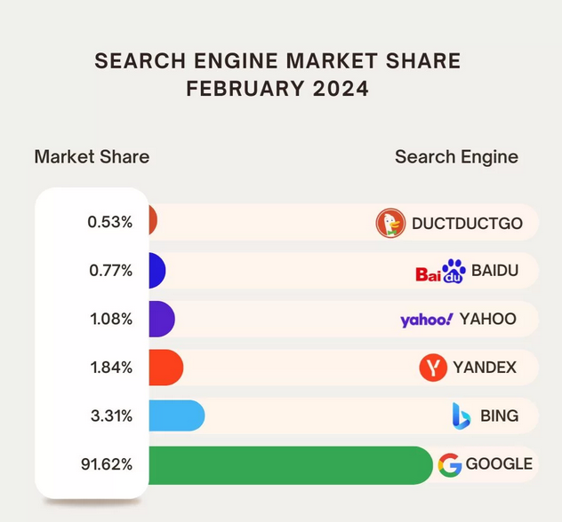 جوجل هو محرّك البحث رقم 1 على مستوى العالم، يستحوذ بالضبط على 91.9% من عمليات البحث. جوجل هو الموقع رقم (1) في العالم، وهو بالتالي أكثر المواقع زيارة يوميًا على الإطلاق.